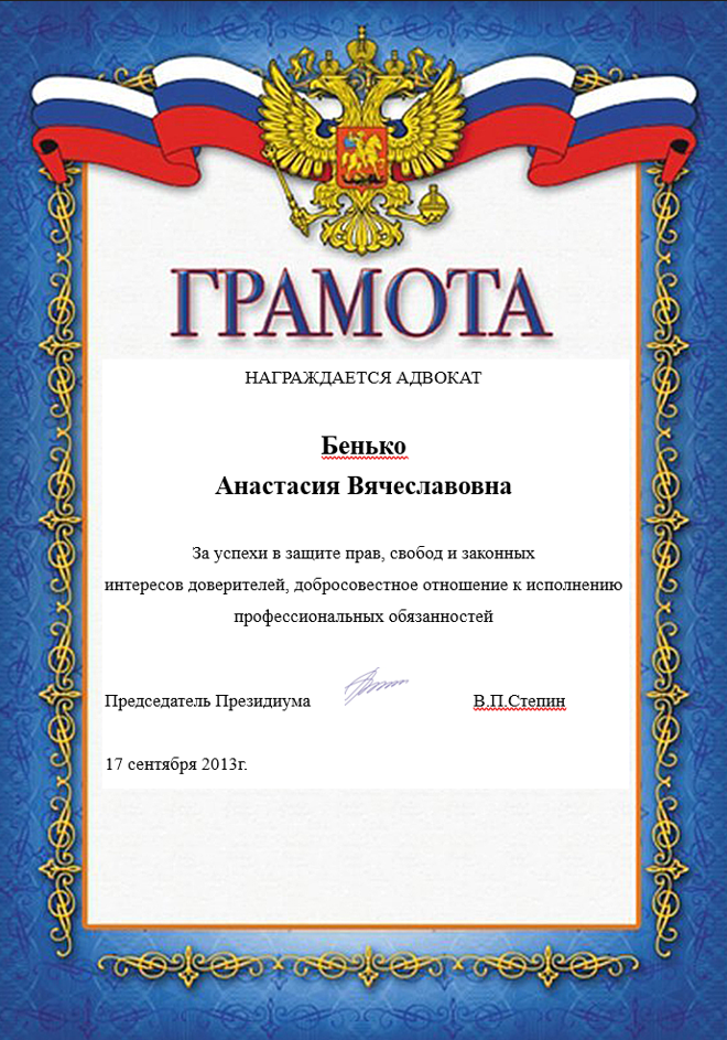 Бенько Анастасия Вячеславовна — юрист с 14-летним опытом работы, специализирующаяся на защите прав граждан с 2010 года. Предоставляет бесплатные консультации по телефону. Имеет обширный опыт ведения судебных дел на различных уровнях. Оказывает профессиональную помощь по гражданским и другим вопросам. Задайте вопрос о вашей проблеме Адвокату по телефону казанному на нашем сайте.
